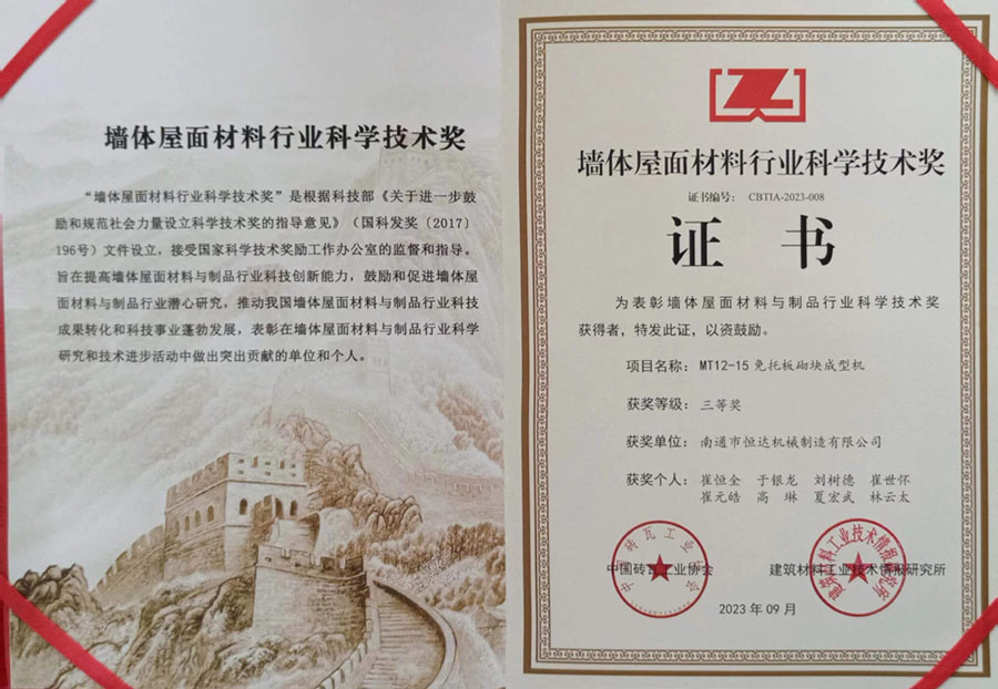 南通市恒達機械制造有限公司獲得墻體屋面材料行業(yè)科學(xué)技術(shù)三等獎。