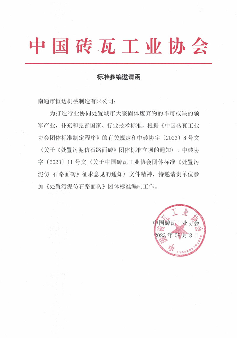 行業(yè)要健康發(fā)展,標準必須先行。再此背景下,2023年10月21-22日,在中國杭州,中國磚瓦協(xié)會及時的組織了行業(yè)骨干企業(yè),群策群力,制定高質(zhì)量標準。南通市恒達機械制造有限公司董事長崔恒全和技術總工于銀龍受邀請參加,為標注的制定貢獻恒達力量。